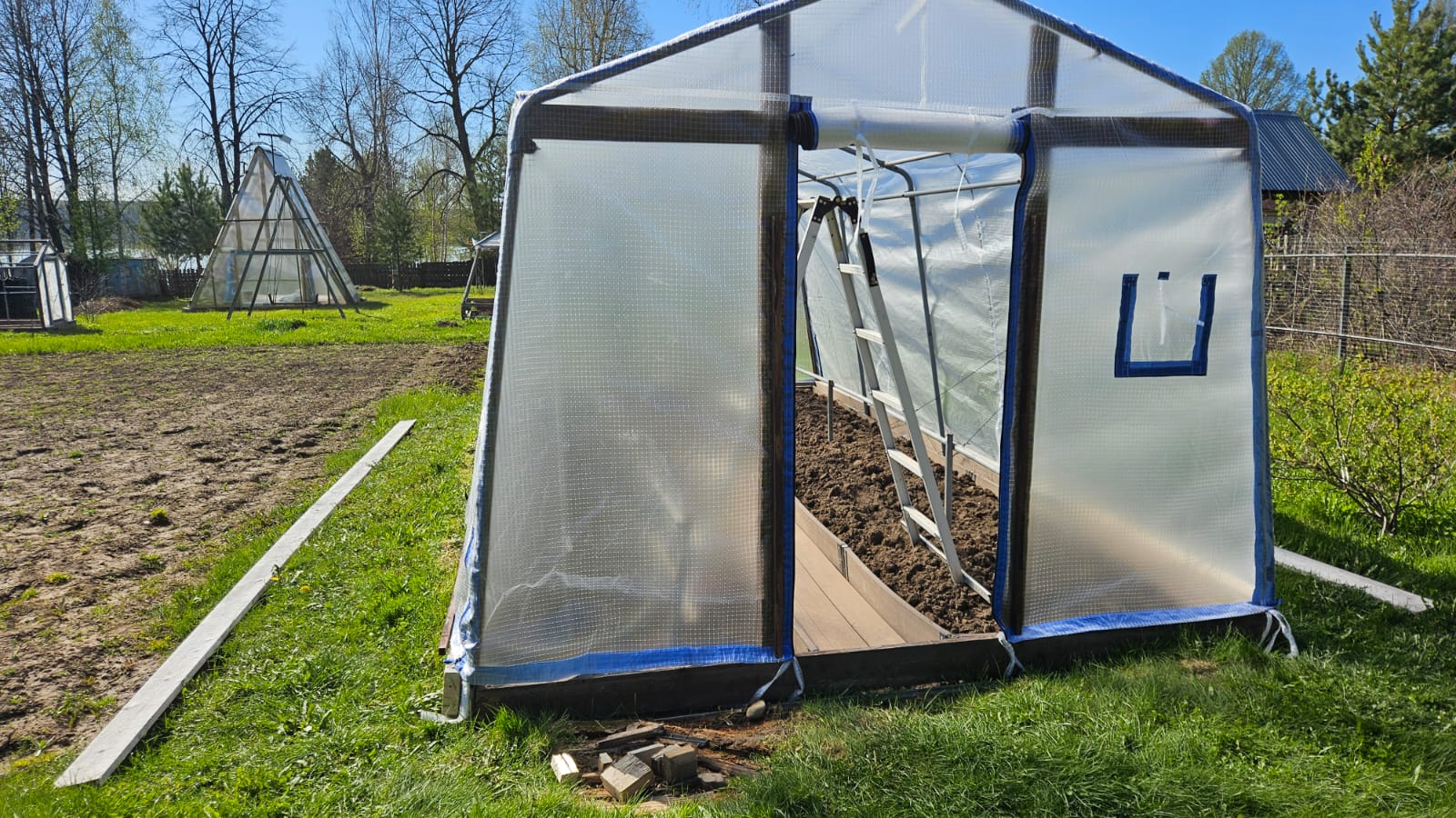 По низу добавлен материал пленки, чтобы чехол доставал до земли. Но все равно мы рекомендуем обустроить низ теплицы фундаментом из бруса или толстой доски, чтобы было к чему крепить и прижимать чехол.